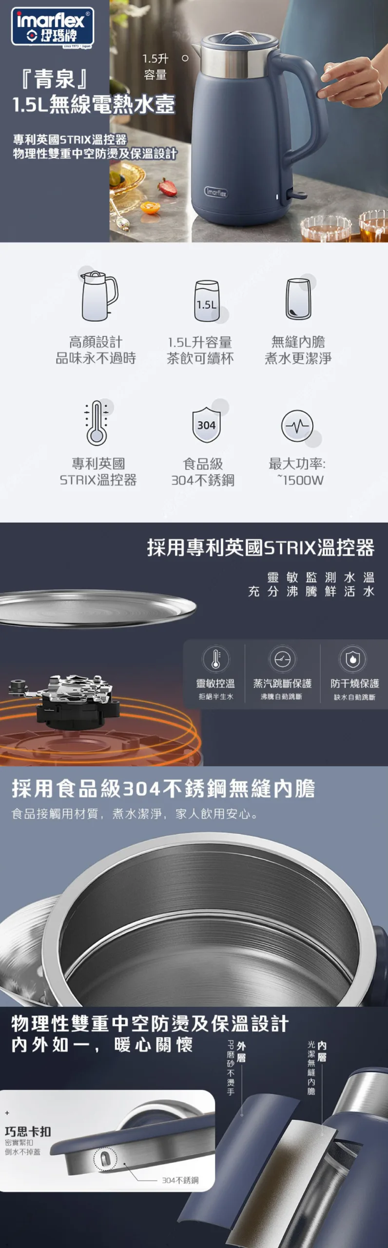 Imarflex 伊瑪牌 『青泉』物理保溫無線電熱水壺 (1.5公升) IKT-15DT
