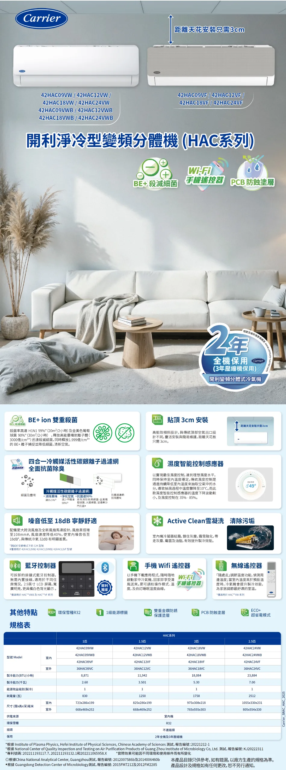 Carrier 開利 2.5匹 R32 變頻分體式冷氣機 (淨冷遙控型) 42HAC24VW