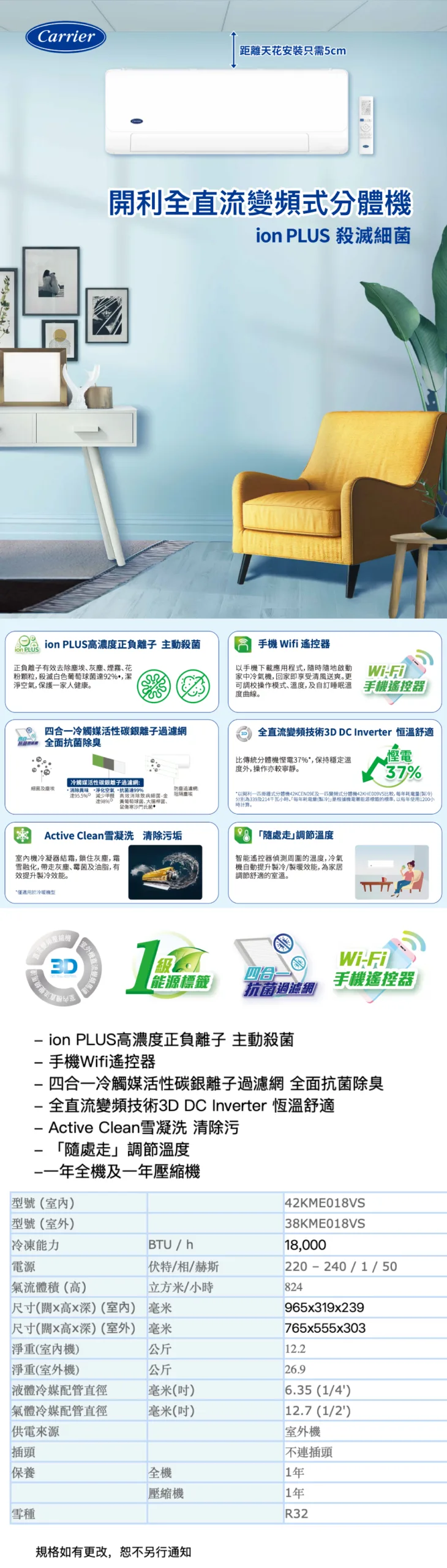 Carrier 開利 2匹全直流變頻掛牆分體式冷氣機 42KME018VS