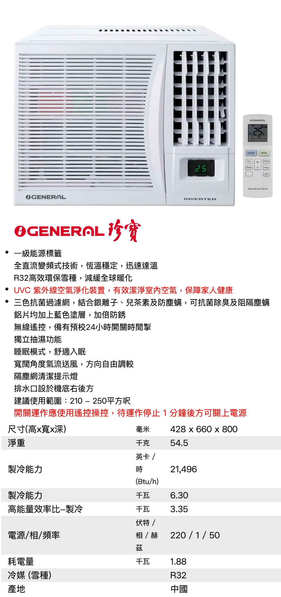 General 珍寶 2.5匹 R32 變頻淨冷窗口式冷氣機 (無線遙控) ALWB24NID