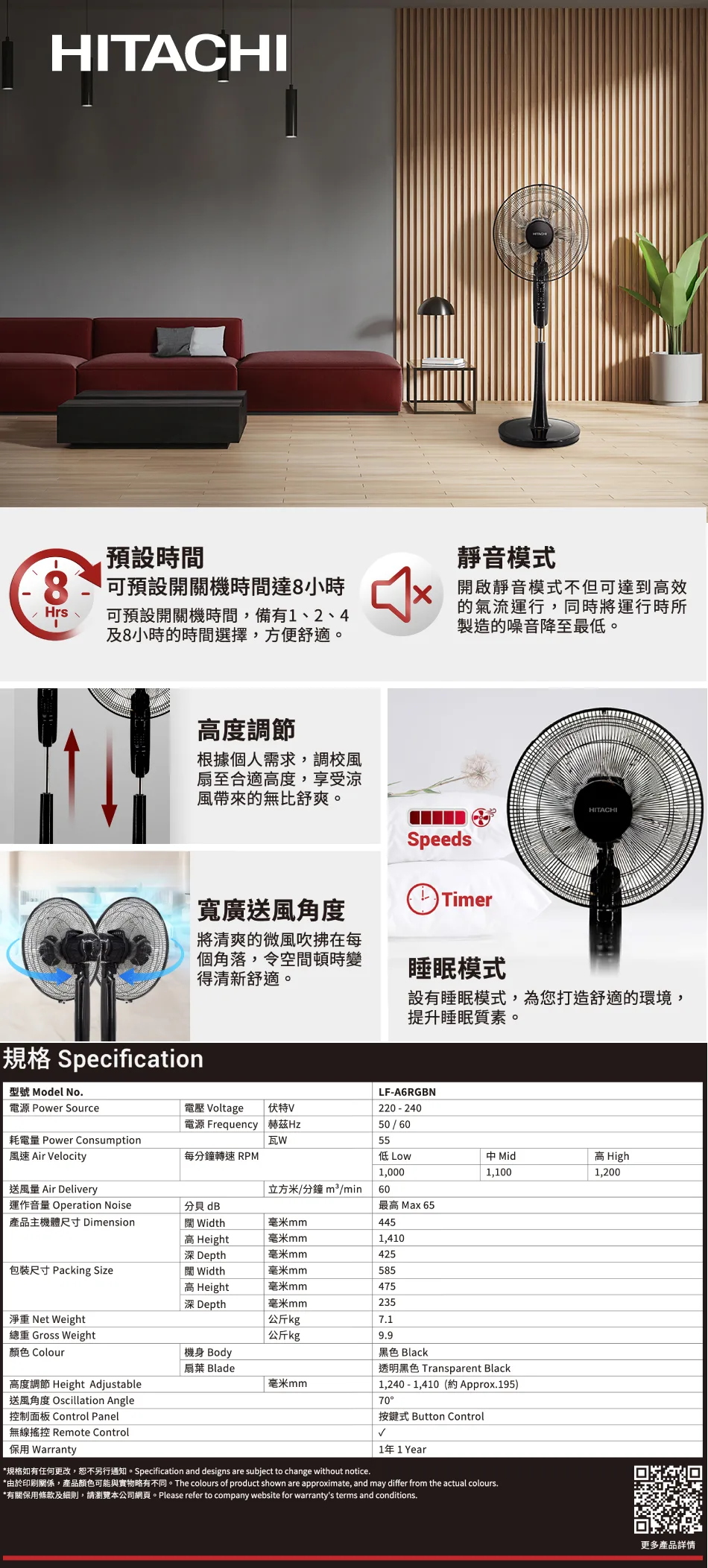 配合高度調節功能,日立 LF-A6RGBN 座地扇是您家中不可多得的清涼助手,它以柔和舒適的風感和智能化的操作,為您打造一個更舒適、更寧靜的生活空間。