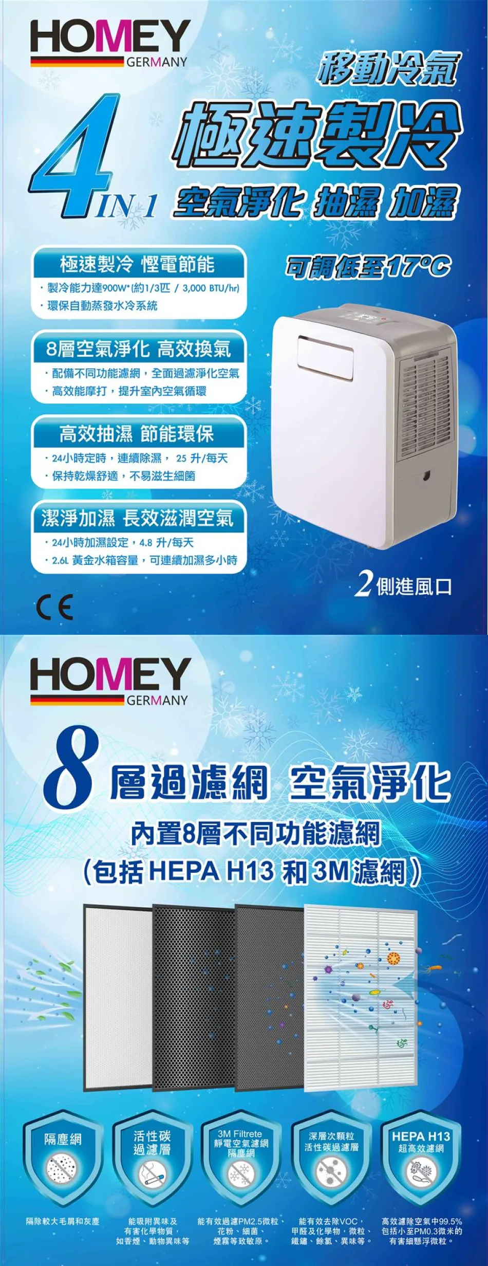 • 4 IN 1移動冷氣,四季皆宜 (極速製冷 、全能淨化 、高效抽濕 及 潔淨加濕)
