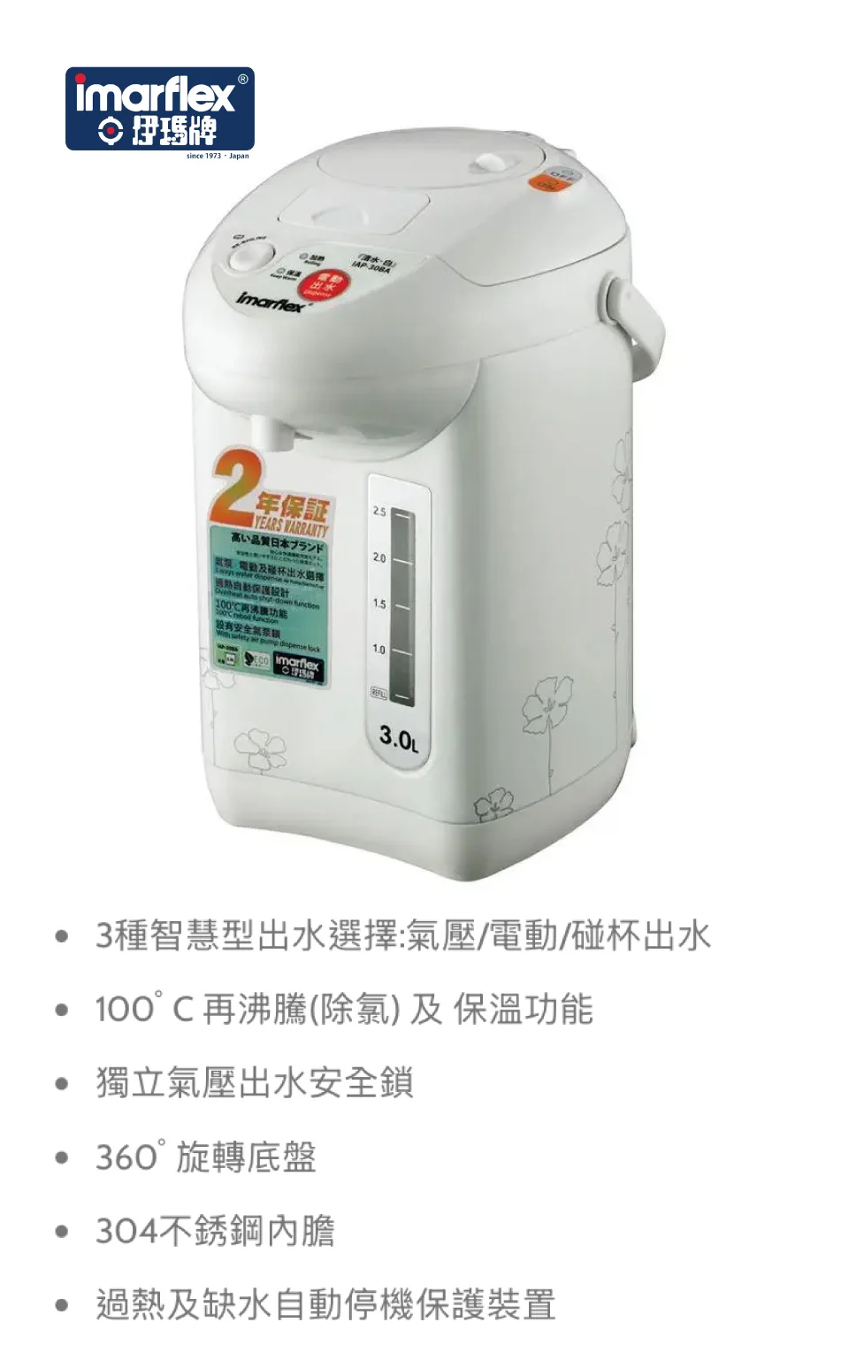 Imarflex 伊瑪牌 『清水.白』微電腦電熱水瓶 (3公升) IAP-30BA