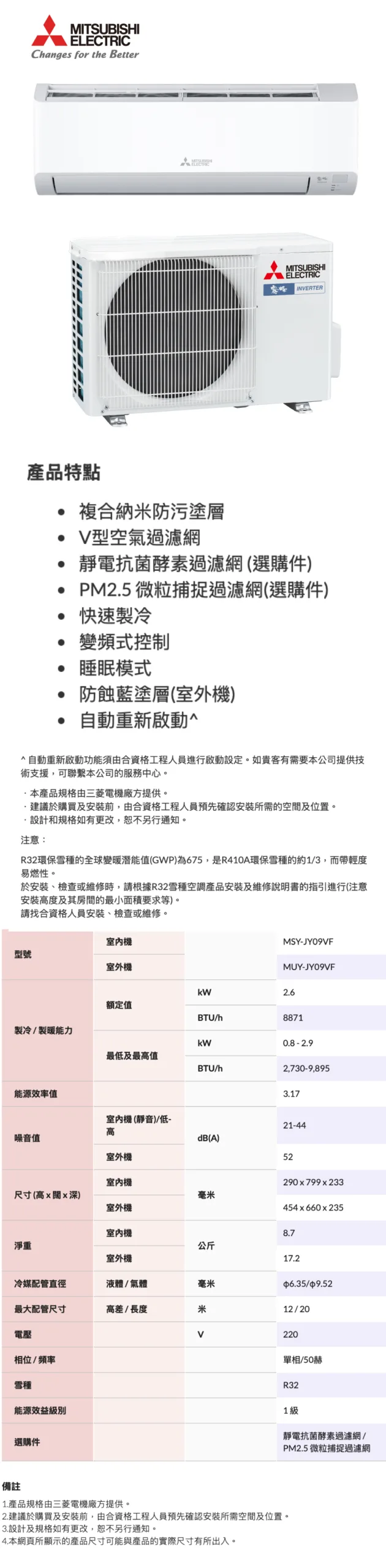 Mitsubishi 三菱 變頻淨冷掛牆式分體冷氣機 1匹 MSY-JY09VF