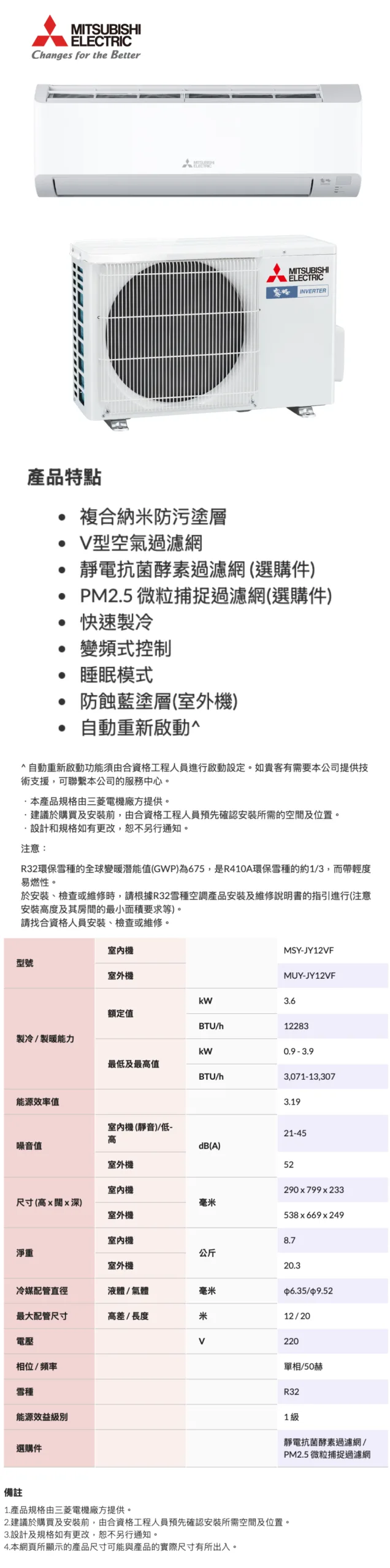 Mitsubishi 三菱 變頻淨冷掛牆式分體冷氣機 1.5匹 MSY-JY12VF