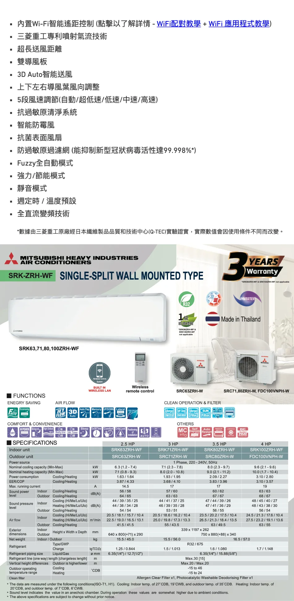 Mitsubishi Heavy 三菱重工 2.5匹 R32 變頻冷暖掛牆分體式冷氣機 (內置Wi-Fi) SRK63ZRH-WF