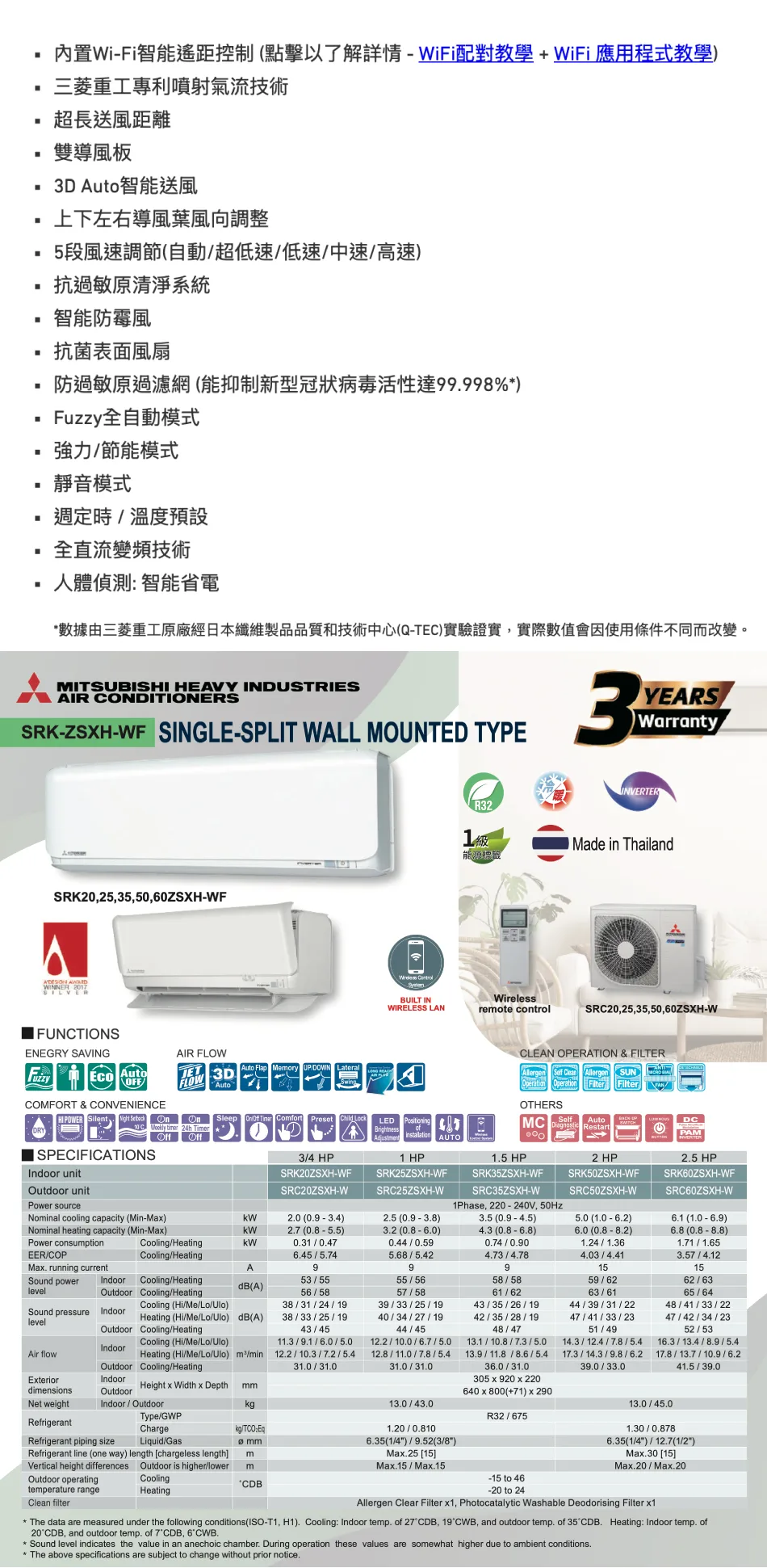 Mitsubishi Heavy 三菱重工 3/4匹 R32 變頻冷暖掛牆分體式冷氣機 (內置Wi-Fi) SRK20ZSXH-WF/SRC20ZSXH-W