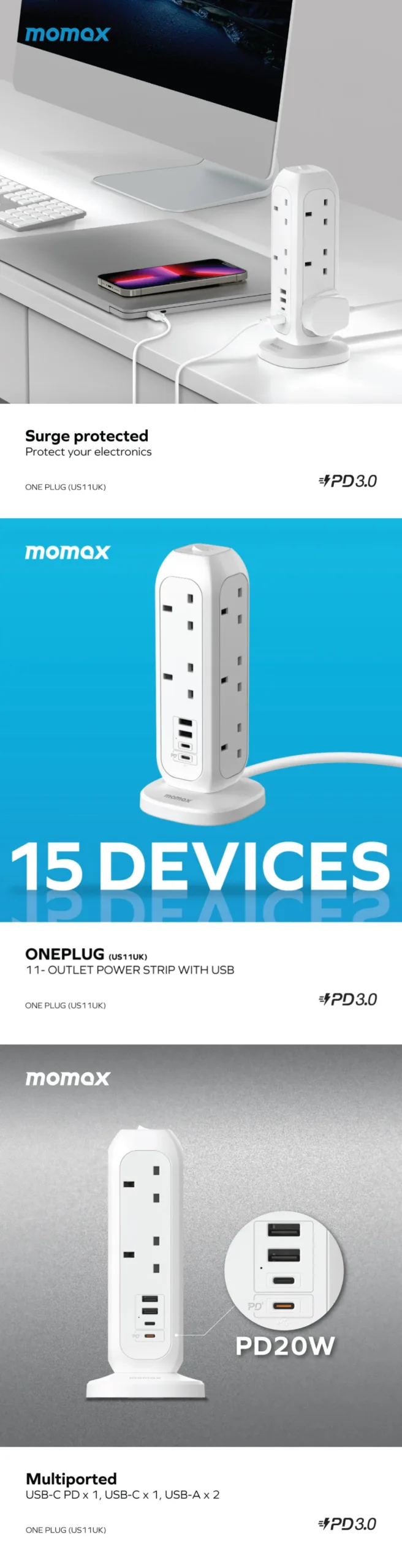 在數碼產品充斥我們生活的今天,尋求一個高效、安全且不佔空間的充電解決方案,已成為每個人家中的剛性需求。Momax 這款 ONEPLUG US11UKW 直立式拖板,不僅是一個電源插座,更是為您的家庭量身打造的「功能發電站」,重新定義了多設備供電的標準。