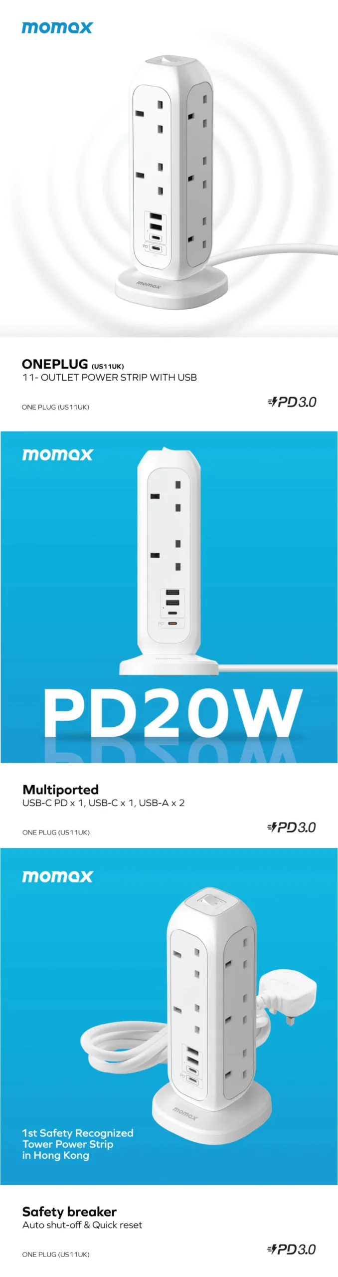 Momax ONEPLUG PD20W 2A2C 11位拖板 US11UKW:香港首獲安全認證的快充中樞