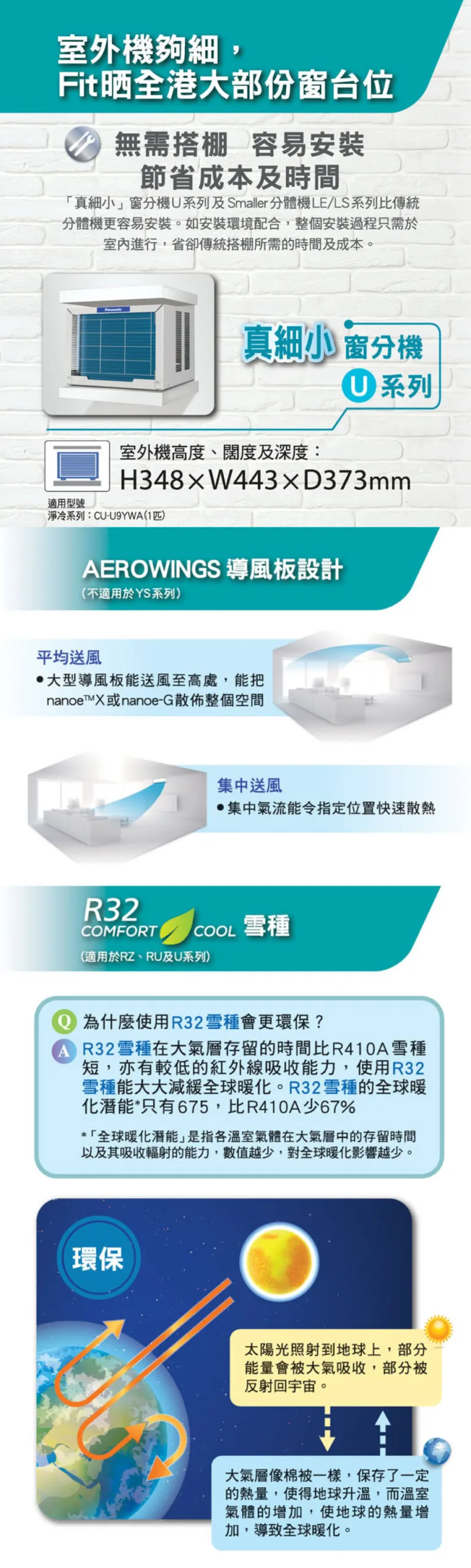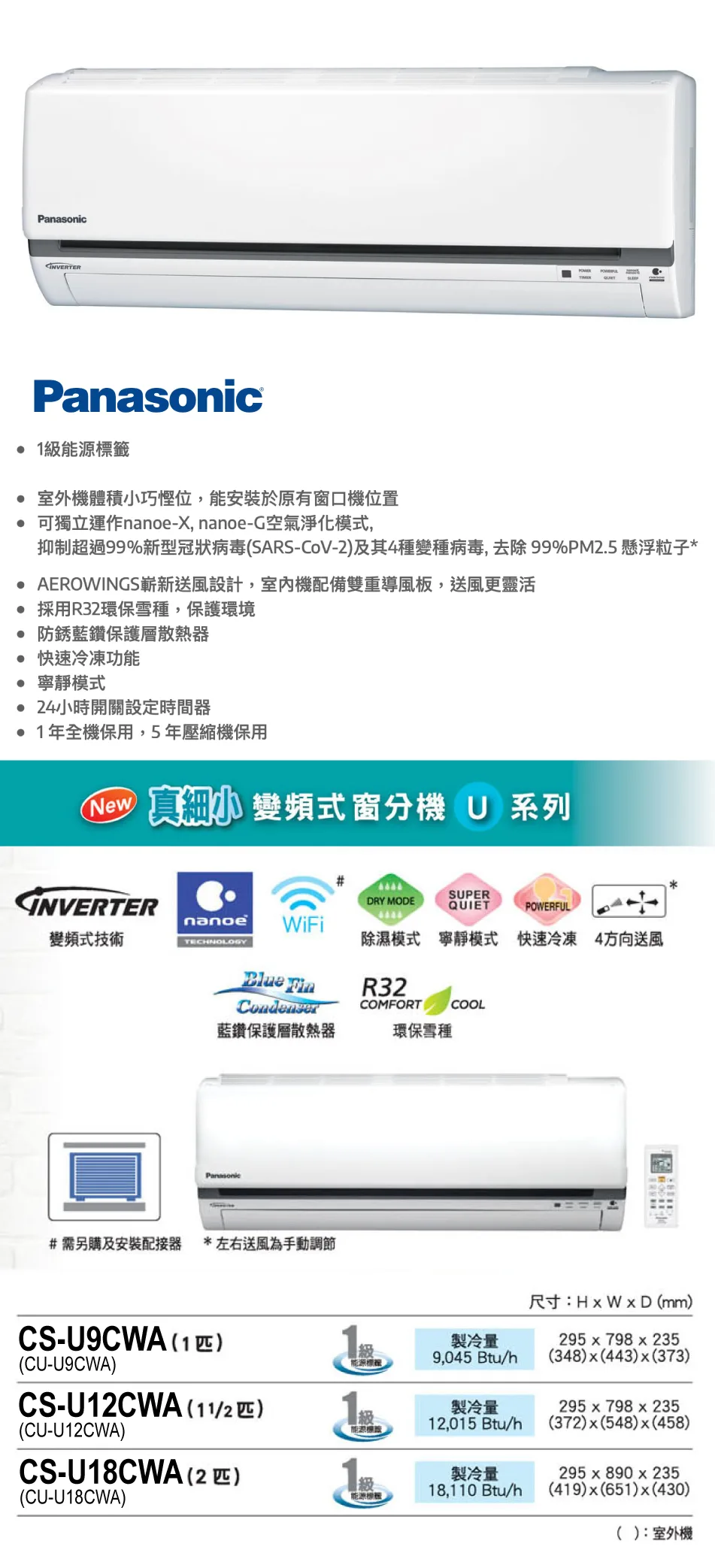 Panasonic 樂聲 1.5匹 R32 變頻淨冷窗口式分體冷氣機 (附無線遙控器) CS-U12CWA