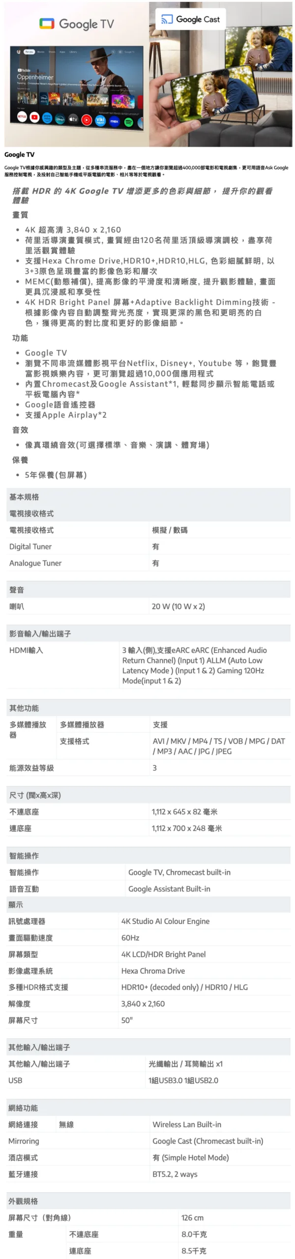 Panasonic 樂聲 50吋 4K LED 智能電視 TN-50W70BGH