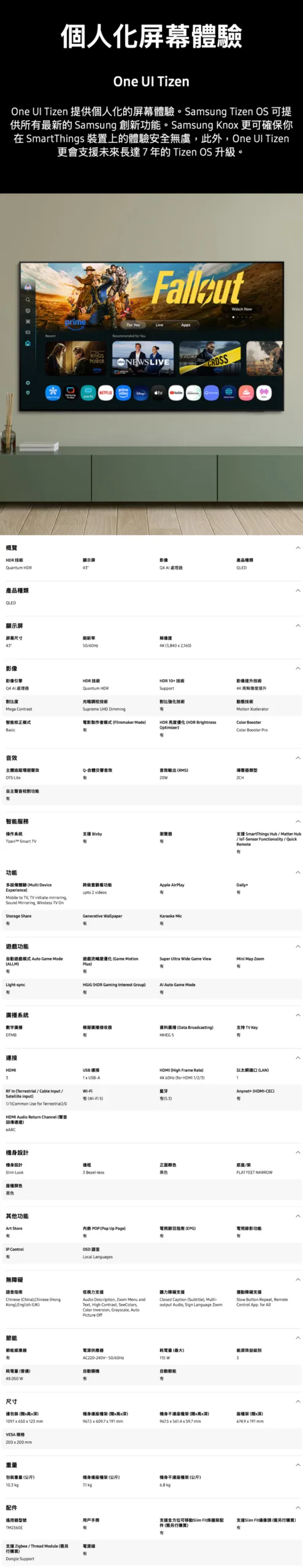 Samsung 三星 43吋 QLED Q7F 4K Samsung Vision AI Smart TV 智能電視 (2025) QA43Q7FAAJXZK
