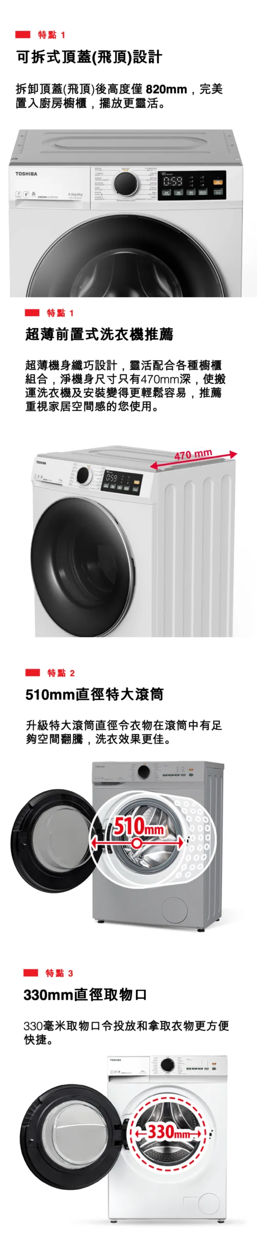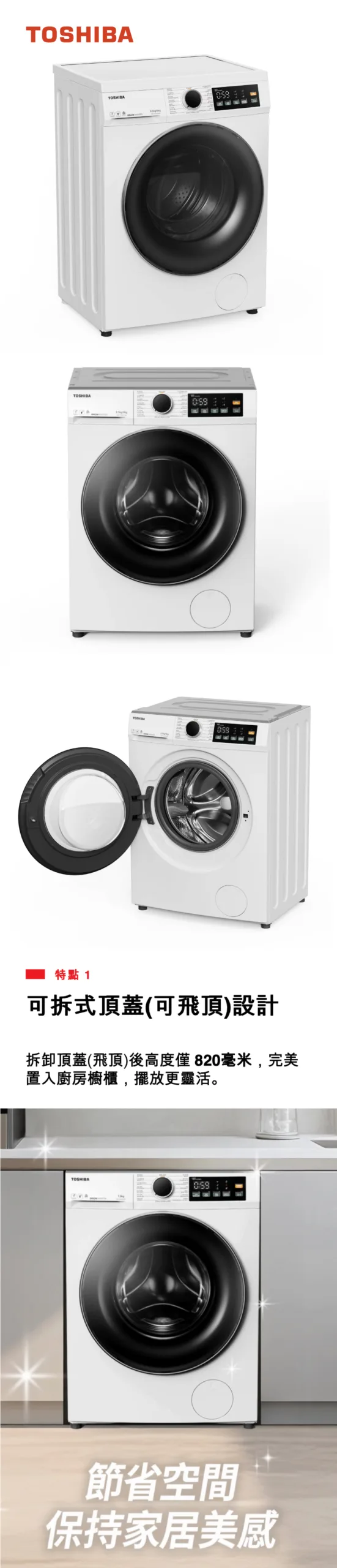 Toshiba 東芝 超薄身前置式變頻洗衣乾衣機 (飛頂型號) (8.5kg/6kg, 1400轉/分鐘) TWD-T22BU95UWH(WK)-B
