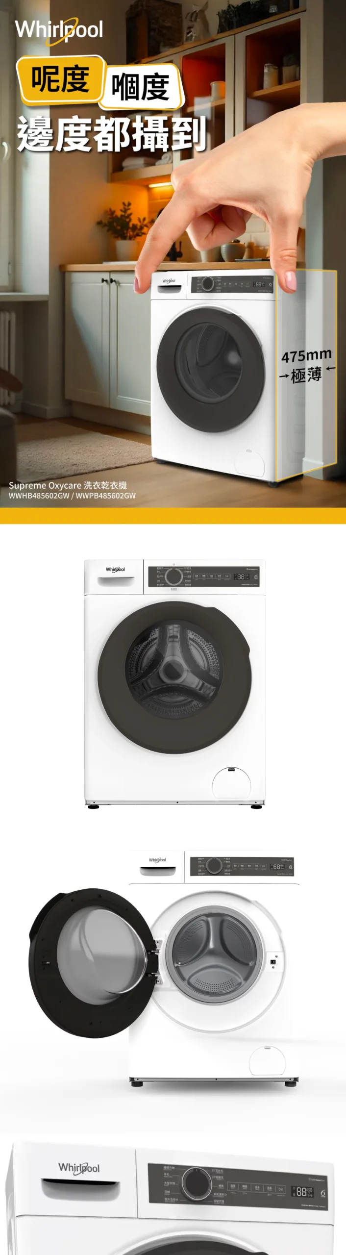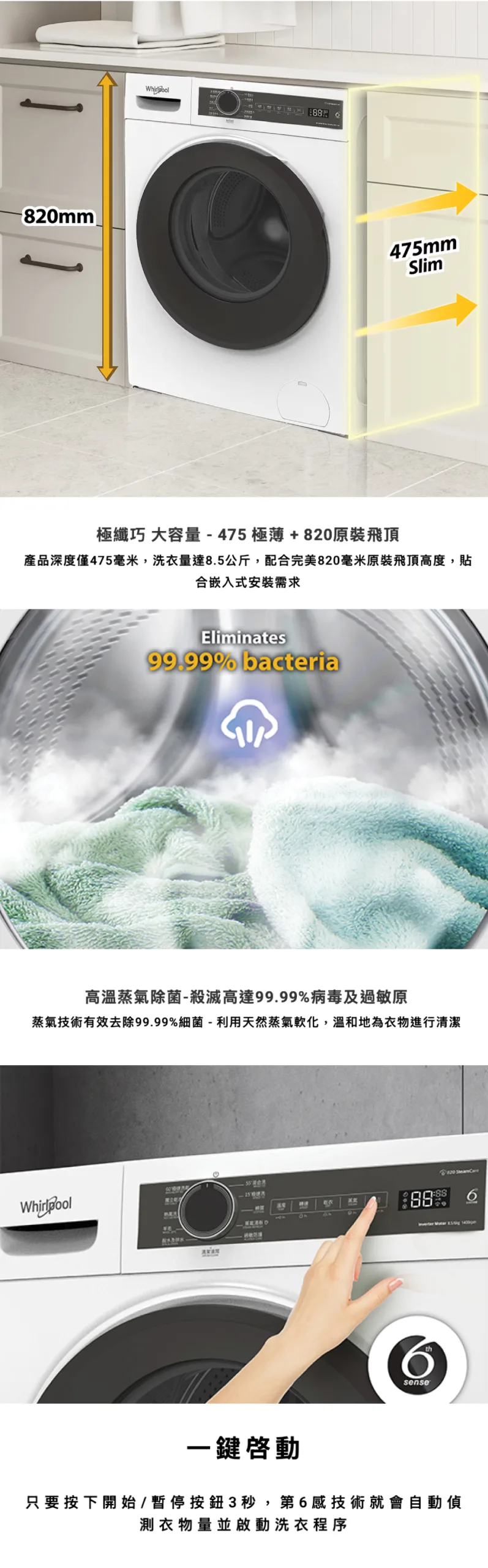 Whirlpool 惠而浦 820 SteamCare 纖薄前置式洗衣機 (8.5公斤, 1400轉/分鐘) FWPB48502GW