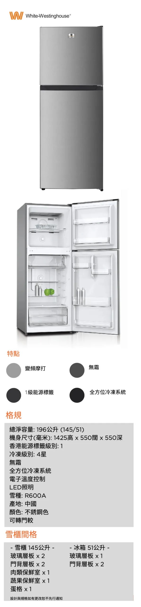 White-Westinghouse 變頻雙門雪櫃 WTI197X