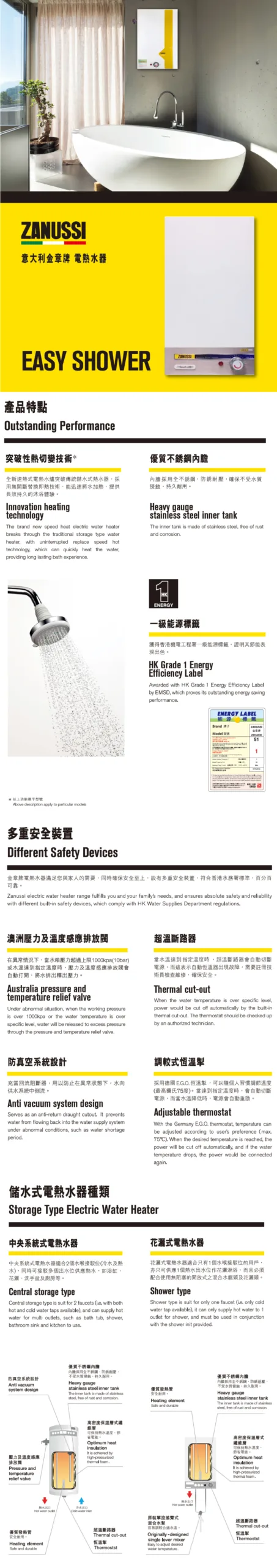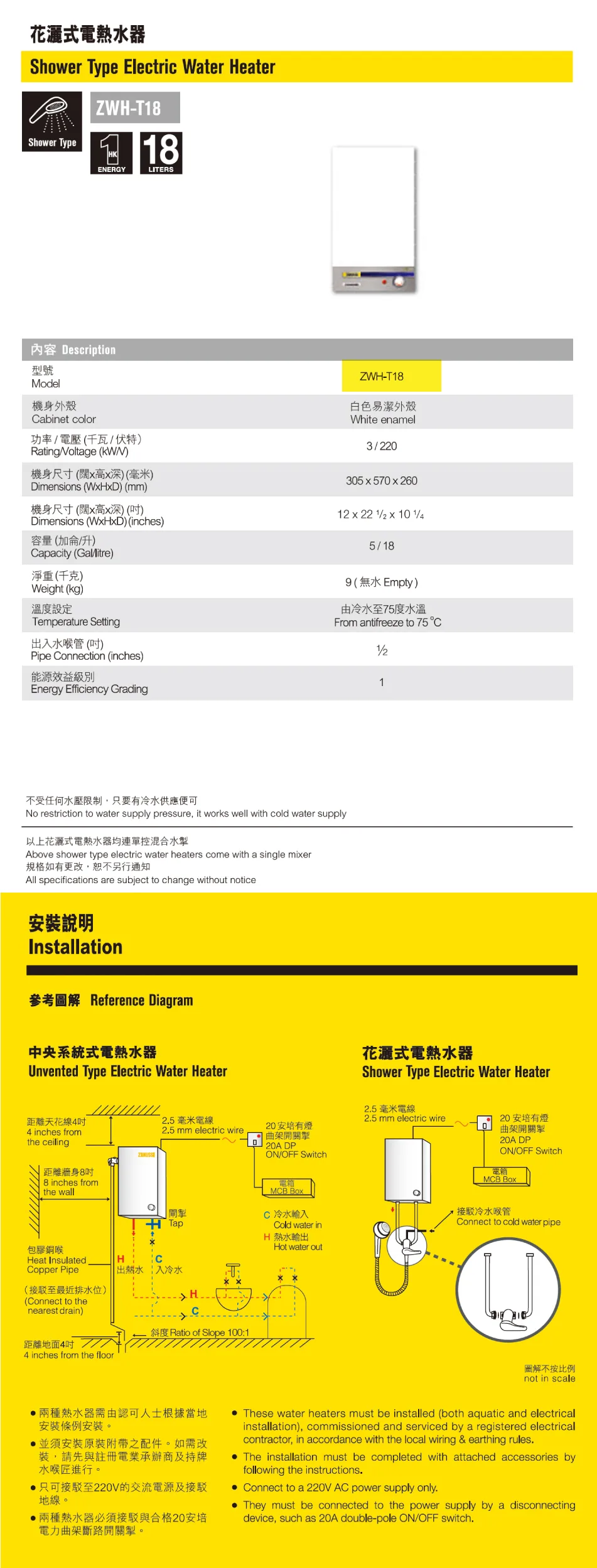 Zanussi 金章 18公升花灑儲水式電熱水器 (單相) ZWH-T18